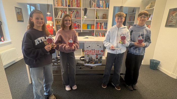 Dies konnten auch die Zuhörerinnen und Zuhörer beim Schulentscheid des Vorlesewettbewerbs der 6. Klassen erleben, der am 05. Dezember 2025 in unserer weihnachtlich geschmückten Bibliothek stattfand. Die vier Vorleserinnen und Vorleser Paul (6a), Greetje (6b), Elin (6c) und Felix (6d), die jeweils ihren Klassenentscheid gewinnen konnten, nahmen das Publikum mit auf eine Reise in verschiedene literarische Welten: Die Zuhörerinnen und Zuhörer fanden sich in den turbulenten Tagen eines „Möchtegern-Versagers“ wieder, erlebten mit Rico die beeindruckende, hektische Großstadt Berlin und seine aufregende Suche nach seinem Freund Oskar und landeten letztlich bei dem Hobbit Bilbo Beutlin und seinen Freunden im fantastischen Mittelerde. Alle zogen das Publikum durch ihre lebendigen Vorträge in ihren Bann.