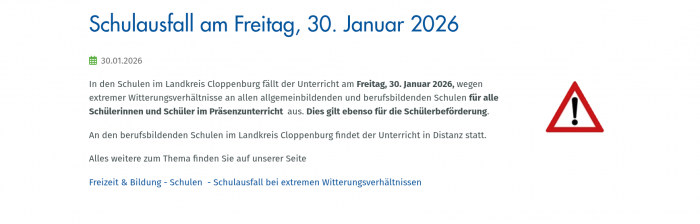 In den Schulen im Landkreis Cloppenburg fällt der Unterricht am Freitag, 30. Januar 2026, wegen extremer Witterungsverhältnisse an allen allgemeinbildenden und berufsbildenden Schulen für alle Schülerinnen und Schüler im Präsenzunterricht aus. Dies gilt ebenso für die Schülerbeförderung.